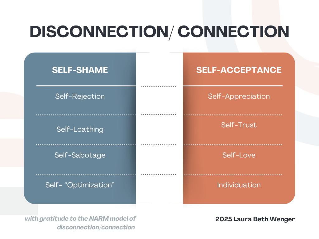 All these strategies function to keep us disconnected from our natural state of self-connection; self appreciation, authentic self-trust, self-acceptance, self-love. As natural as these states are— no baby is born with shame— they can feel fundamentally wrong, not least because our culture does not encourage us to appreciate our own self-worth. We’ve learned, both as children, and as members of a hierarchical culture that privileges some bodies over others (thin, male, cisgendered, heterosexual, white, able-bodied, healthy), how dangerous it can be to connect to our needs; to our own authentic experience of ourselves.